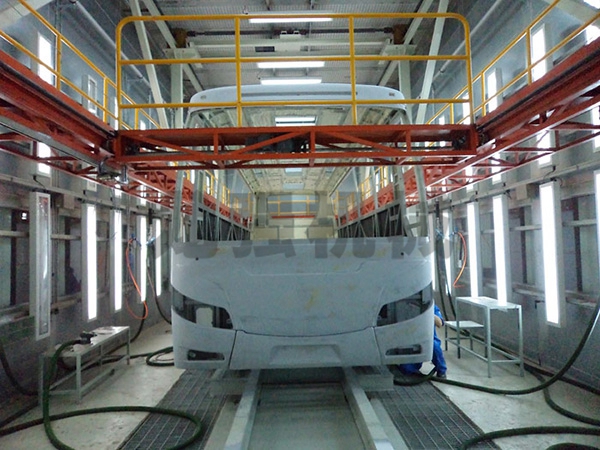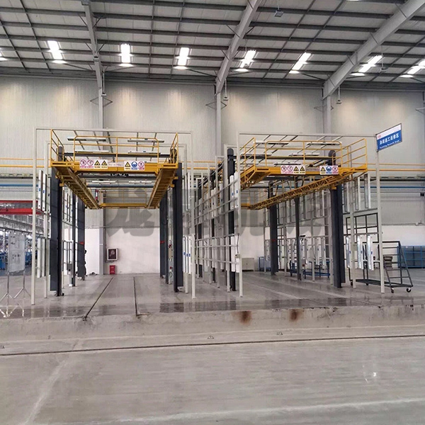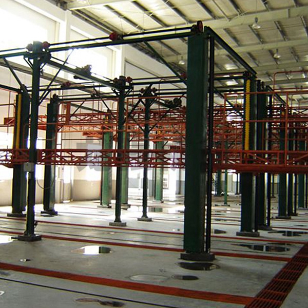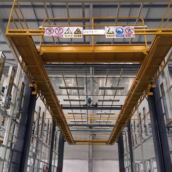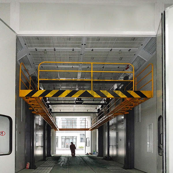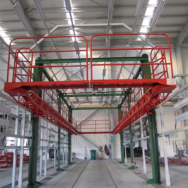 本設備系采用電機連接減速機減速后,通過多軸及鏈輪、鏈條的機械傳動方式改變運動方式,以導向柱導向輪等組成的導向機構,使得操作平臺升降過程的相對穩(wěn)定和整機剛性,在邊立柱的鏈條一端加配重錘,以減少電機工作負荷,減少振動幅度,以達到平臺升降平穩(wěn)的目的,并在平臺貳端設有移動小車,以適應不同車長的需要。采用鋼絲繩保險裝置,鋼絲繩兩端分別與平臺及配重錘連接。當鏈條發(fā)生斷裂時,因鋼絲繩與平臺配重錘連接不至于平臺突然下墜,以便操作人員能及時調整平臺,從而使得操作人員的人身健康。